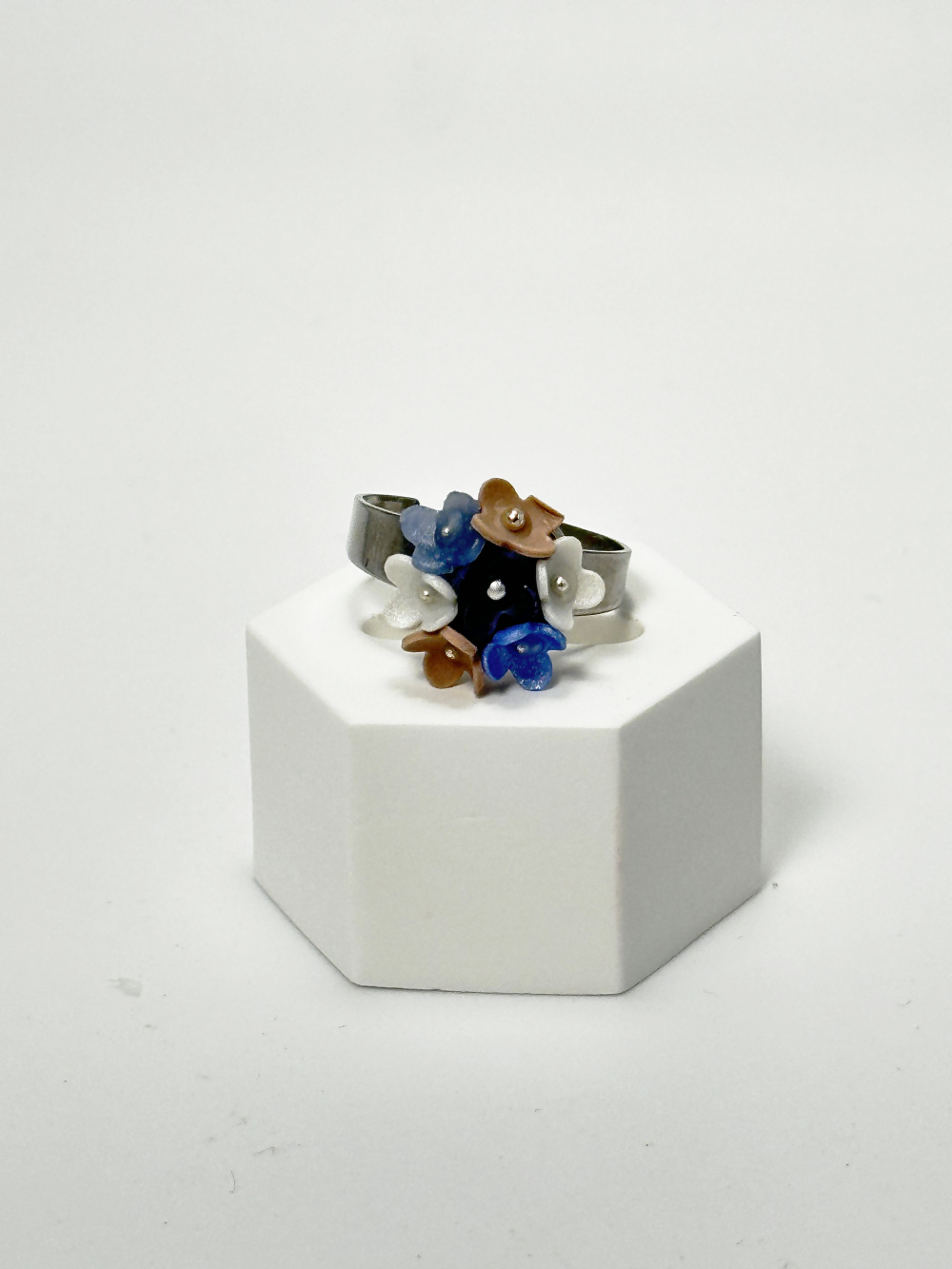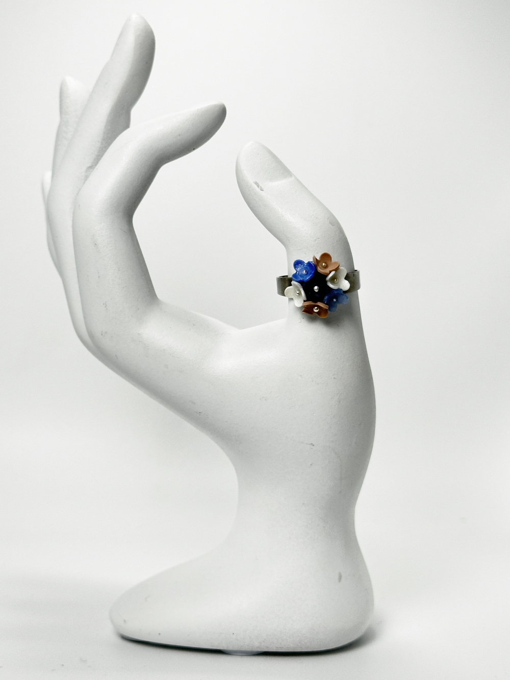 Χειροποίητο δαχτυλίδι σε σχήμα μπλε ορτανσία, φτιαγμένο απο πολυμερικό πηλό. Η βάση απο το δαχτυλίδι είναι απο ανοξείδωτο ατσάλι, υποαλλεργικό και ιδανικό για ευαίσθητο δέρμα. Το δαχτυλίδι ανοίγει και σφίγγει, για να καλύψει κάθε μέγεθος δαχτύλων.