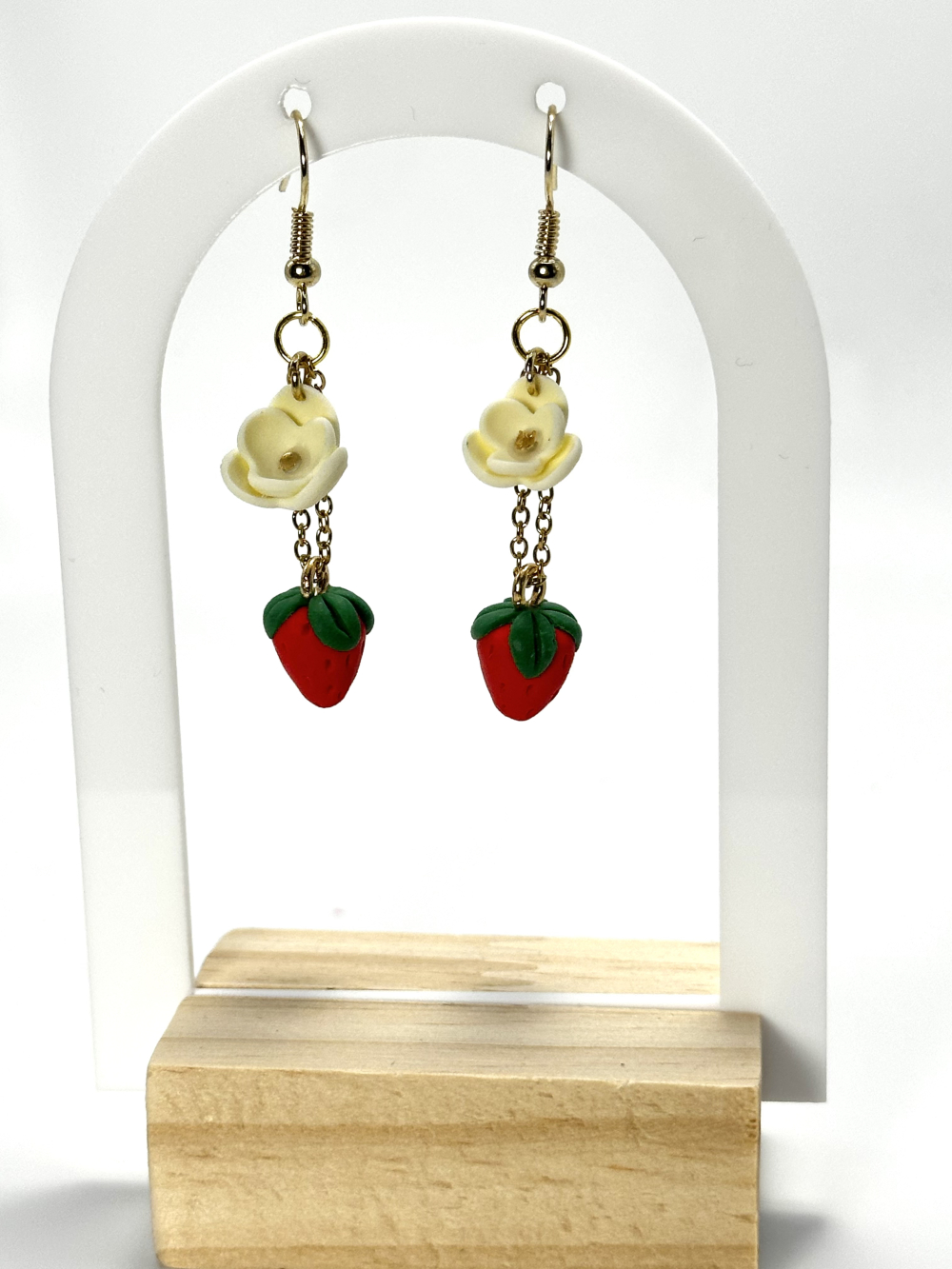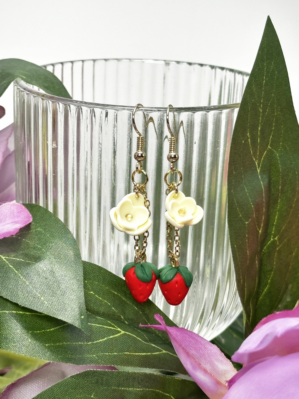Οι Κρεμαστές Φράουλες είναι ένα ζευγάρι σκουλαρίκια που αποτελείται απο μικρά λευκά λουλουδάκια και φραουλίτσες, φτιαγμένα στο χέρι απο πολυμερικό πηλό. Τα κουμπώματα και η αλυσίδα πάνω στα σκουλαρίκια είναι απο ανοξείδωτο ατσάλι.