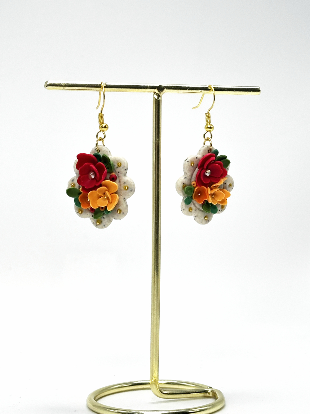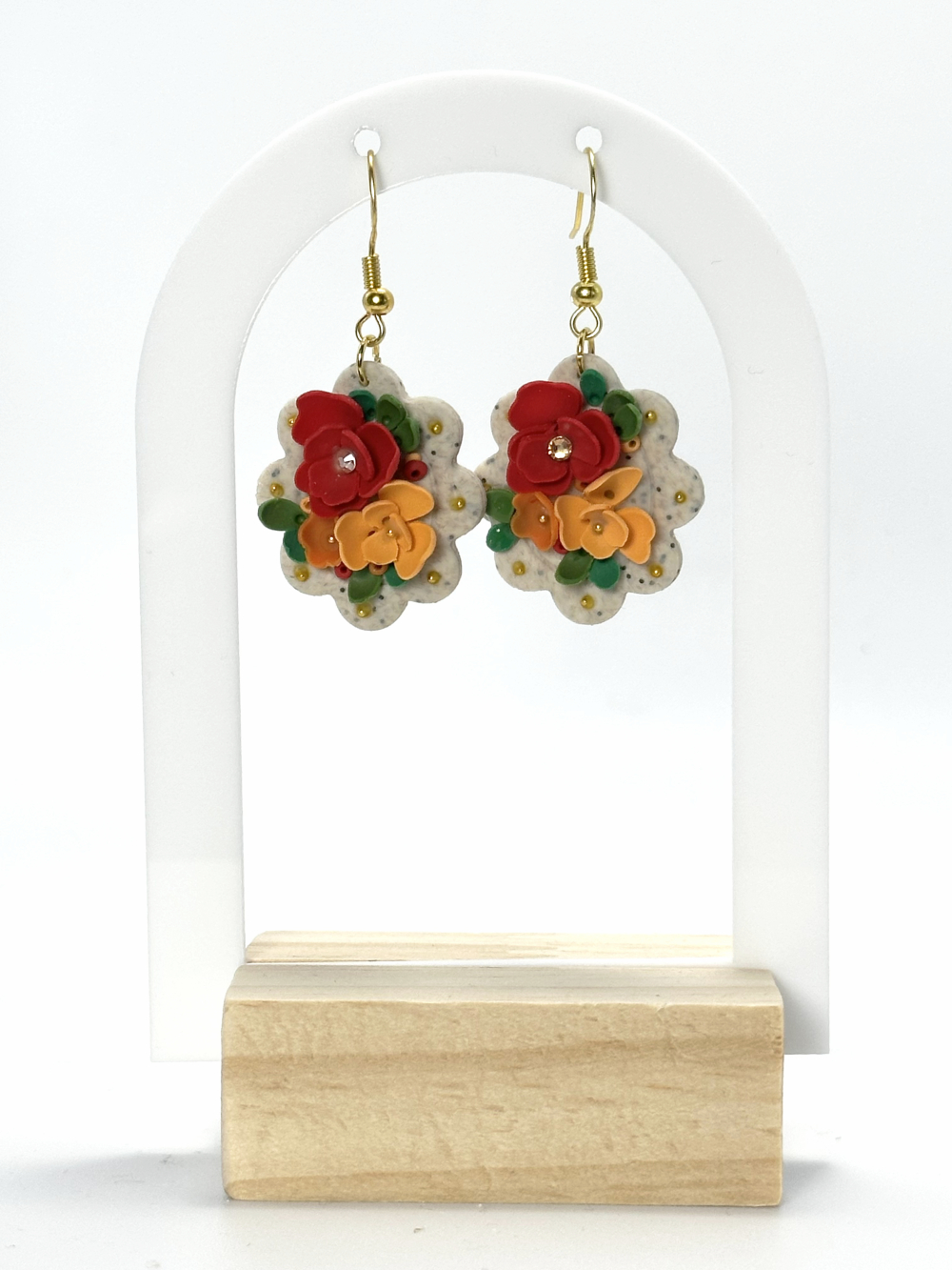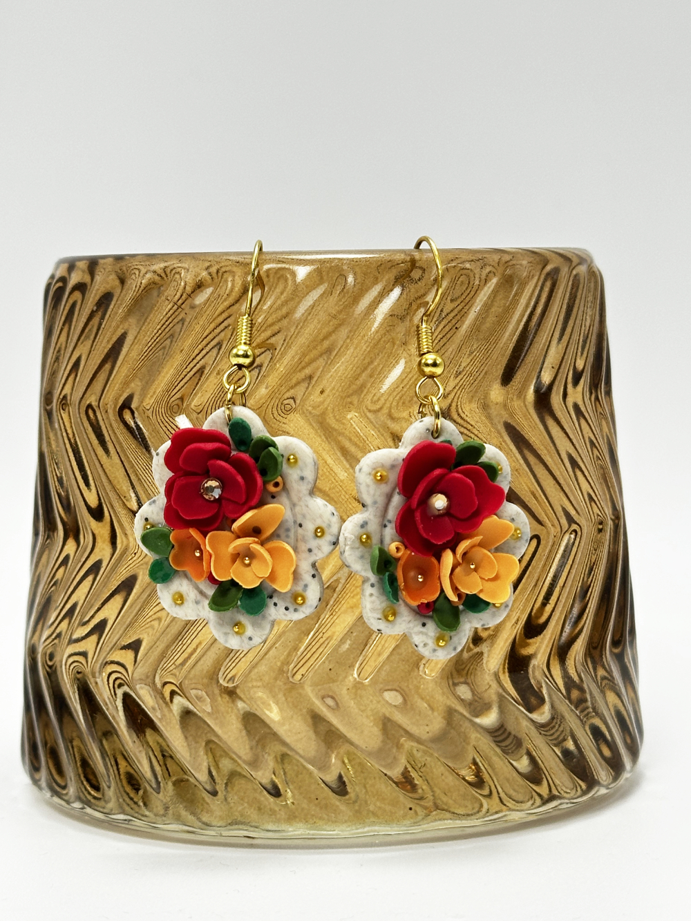 Το Πορτοκαλί μπουκέτο είναι ένα ζευγάρι σκουλαρίκια που αποτελούνται απο διαφορετικά λουλούδια σε διαφορετικές αποχρώσεις του πορτοκαλί και κόκκινου, φτιαγμένα στο χέρι απο πολυμερικό πηλό. Τα κουμπώματα είναι απο ανοξείδωτο ατσάλι.