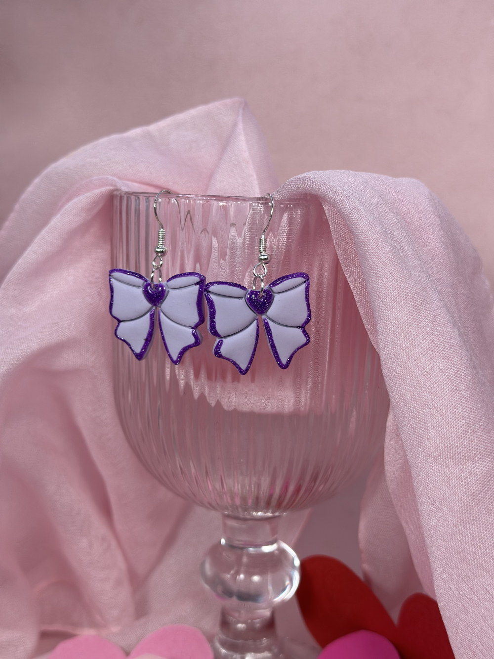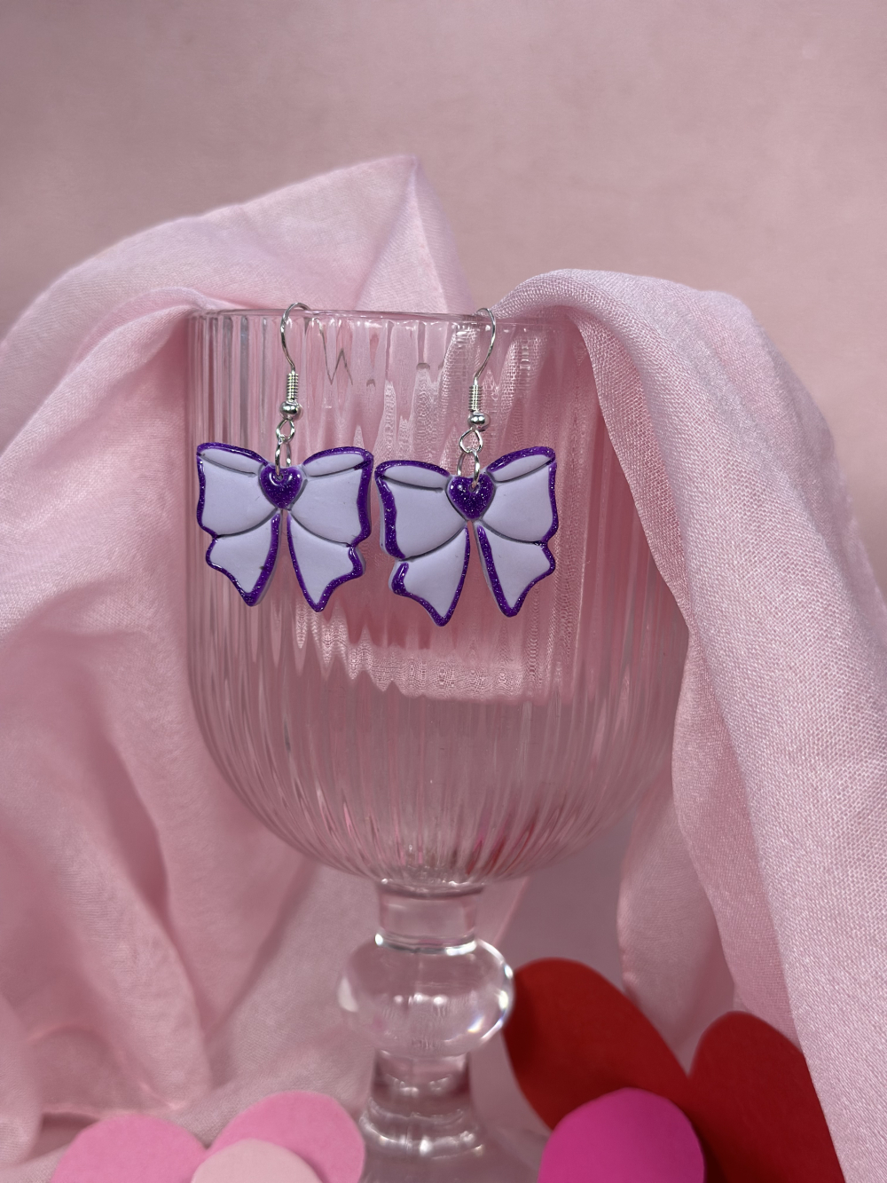 Χειροποίητα σκουλαρίκια μωβ φιόγκοι για την ημέρα του Αγίου Βαλεντίνου. Φτιαμένα με αγάπη απο πολυμερικό πηλό και λεπτομέρειες απο ρητίνη και γκλίτερ. Τα κουμπώματα είναι απο ανοιξείδωτο ατσάλο, το οποίο είναι επάργυρο, ιδανικό για ευαίσθητο δέρμα.