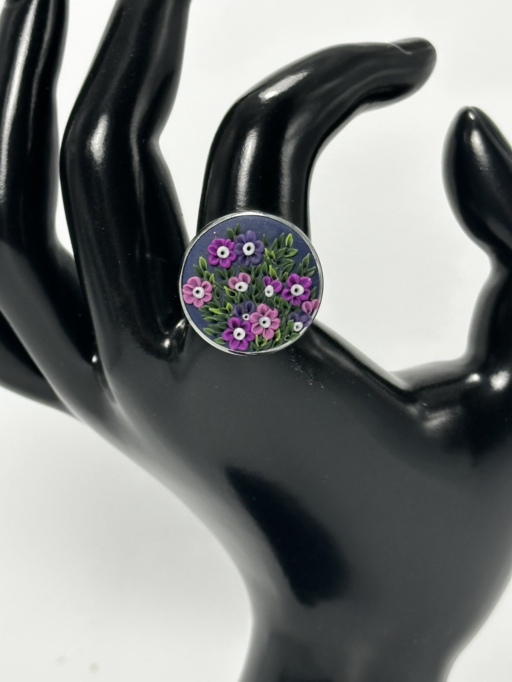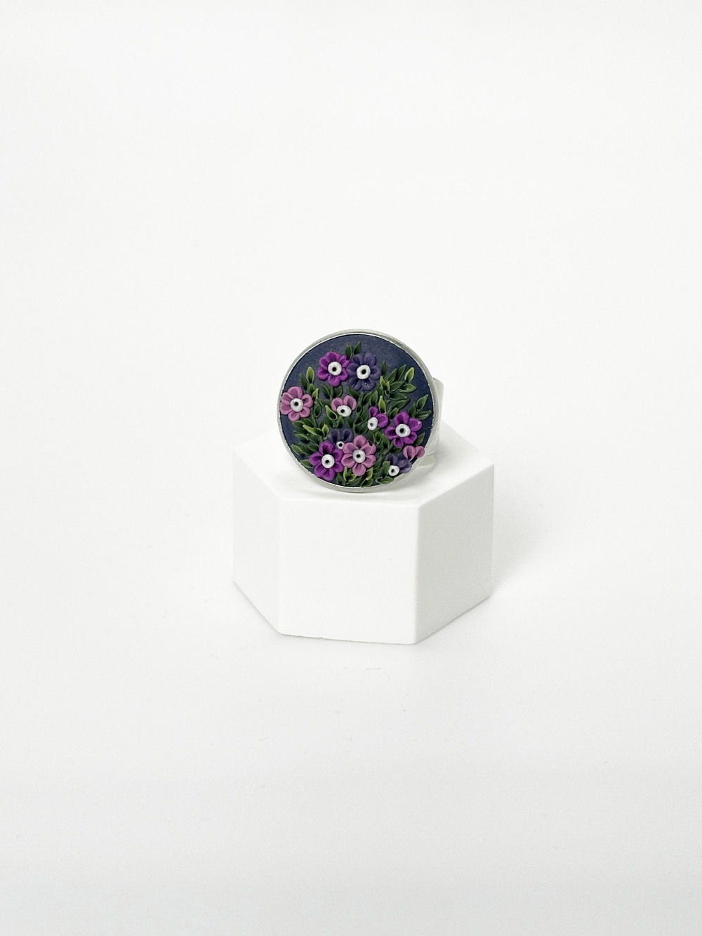 Χειροποίητο δαχτυλίδι με σχέδιο μωβ κήπος, φτιαγμένο απο πολυμερικό πηλό. Η βάση του δαχτυλιδιού είναι απο ανοξείδωτο ατσάλι, υποαλλεργικό και ιδανικό για ευαίσθητο δέρμα. Το δαχτυλίδι ανοίγει και σφίγγει ώστε να καλύψει όλα τα μεγέθη δαχτύλων.