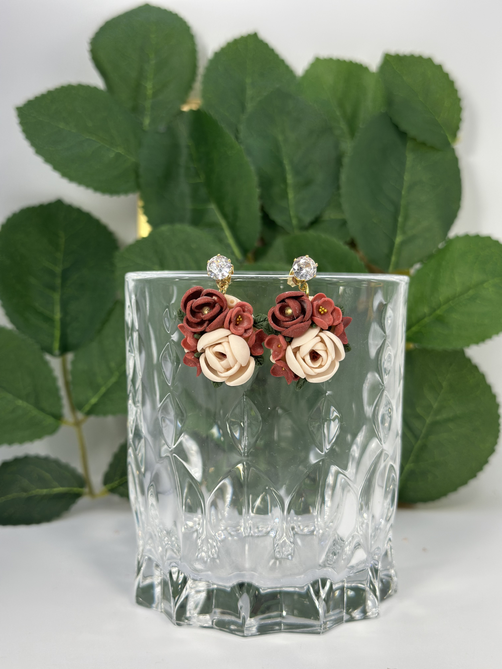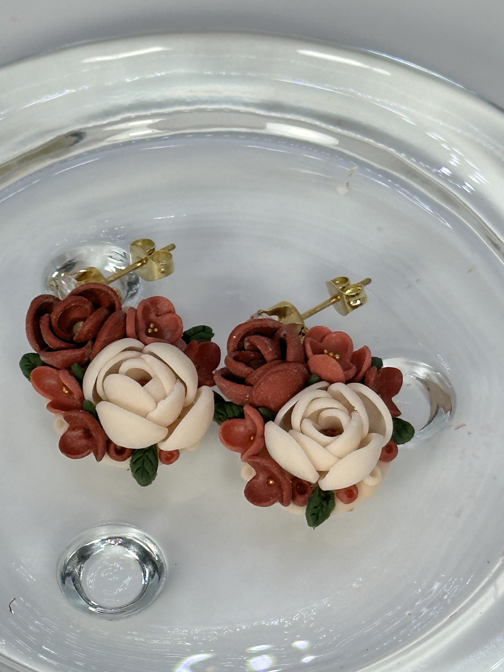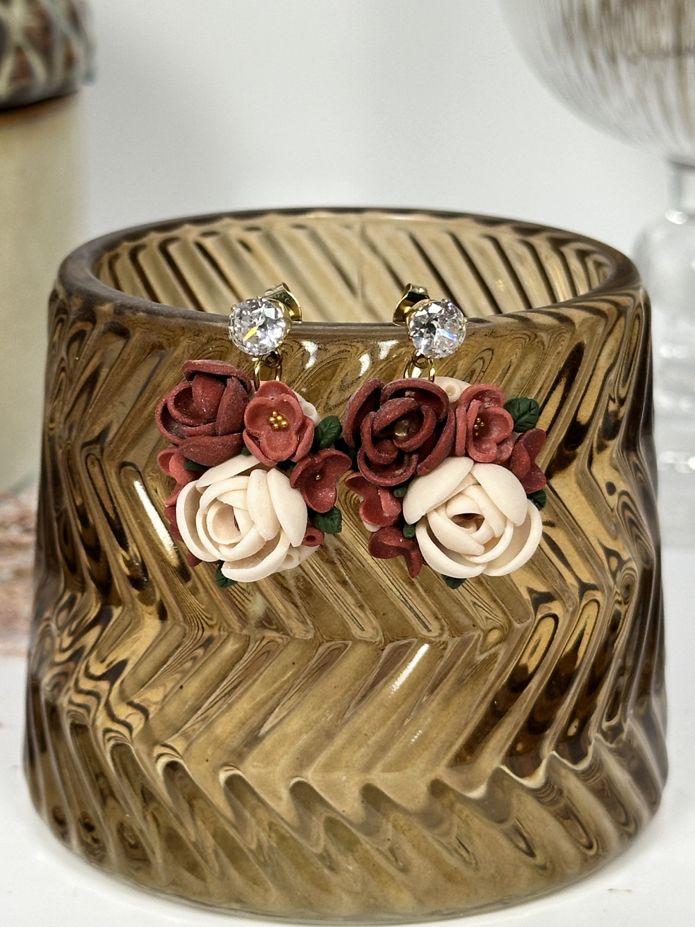 Χειροποίητα φλοράλ σκουλαρίκια σε κόκκινους τόνους, διακοσμημένα με χρωματιστά λουλούδια σε διαφορετικά σχέδια. Φτιαγμένα με αγάπη απο πολυμερικό πηλό. Τα κουμπώματα είναι απο ανοξείδωτο ατσάλι, το οποίο είναι επίχρυσο, ιδανικό για ευαίσθητο δέρμα.