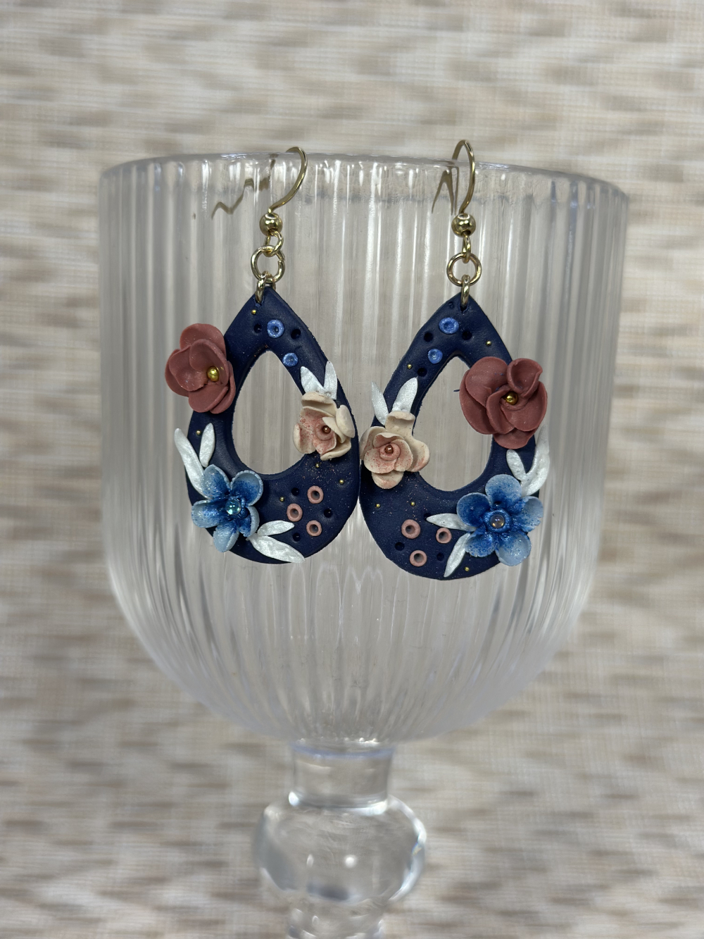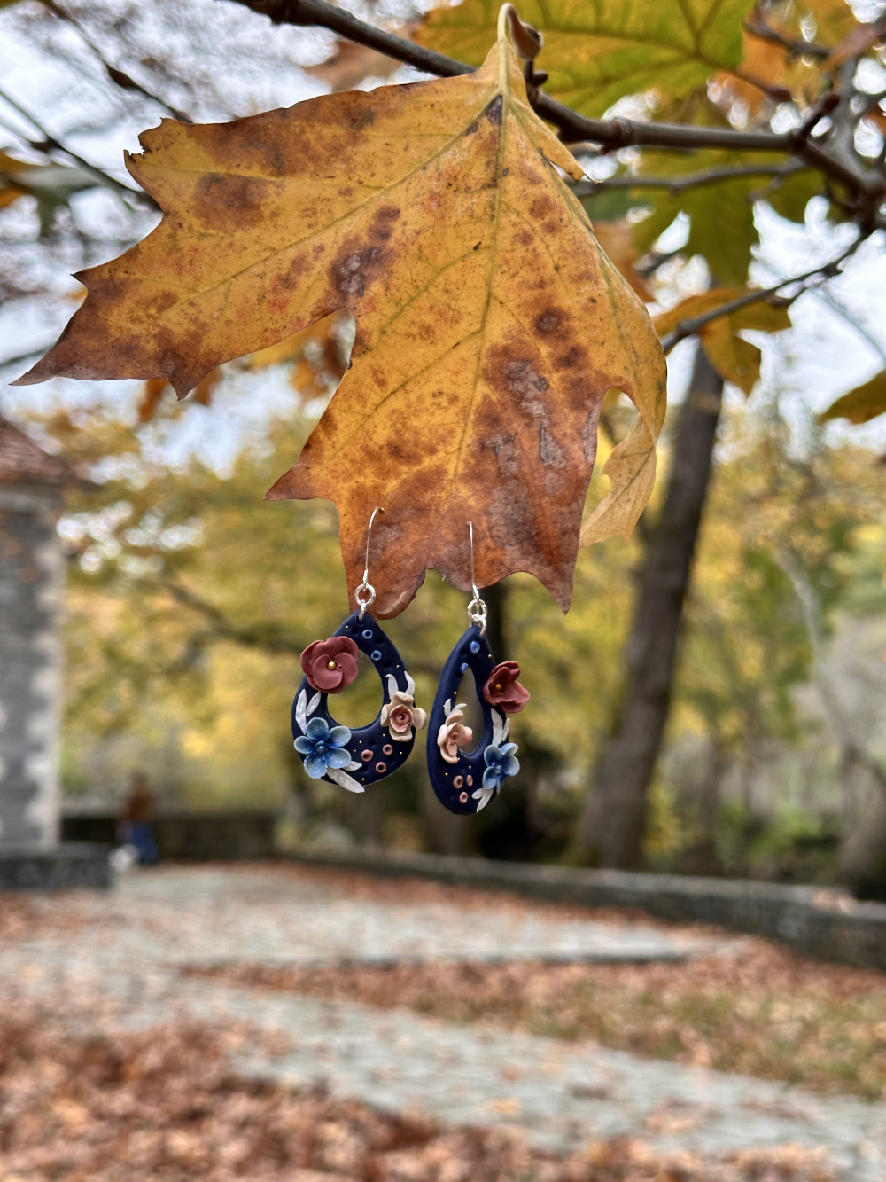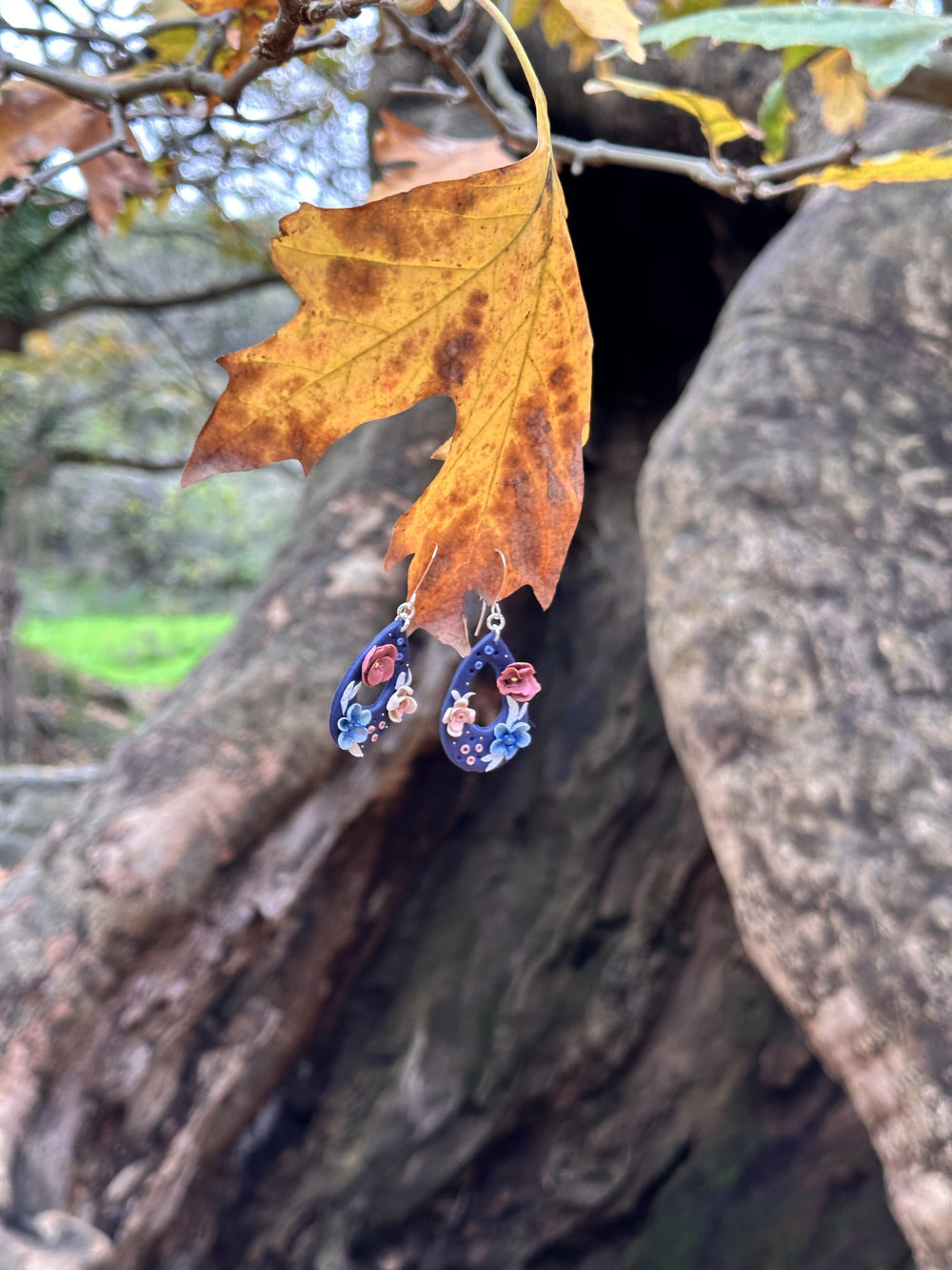 Handmade floral earrings in blue tones, with colorful flowers of different designs. Made with love out of polymer clay. The earring hoops are stainless steel, ideal for sensitive skin.
