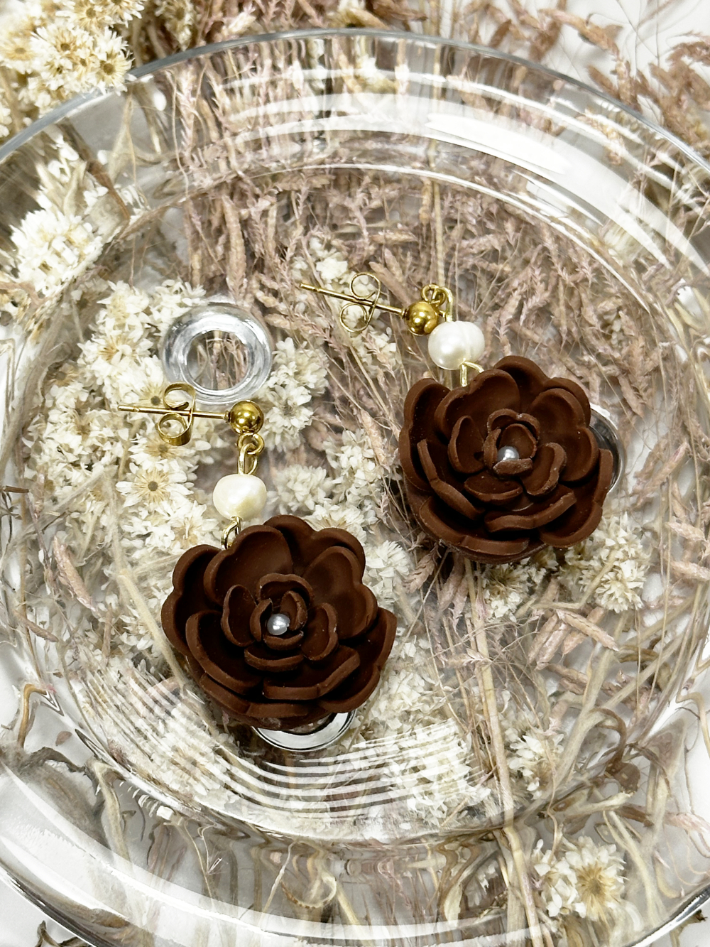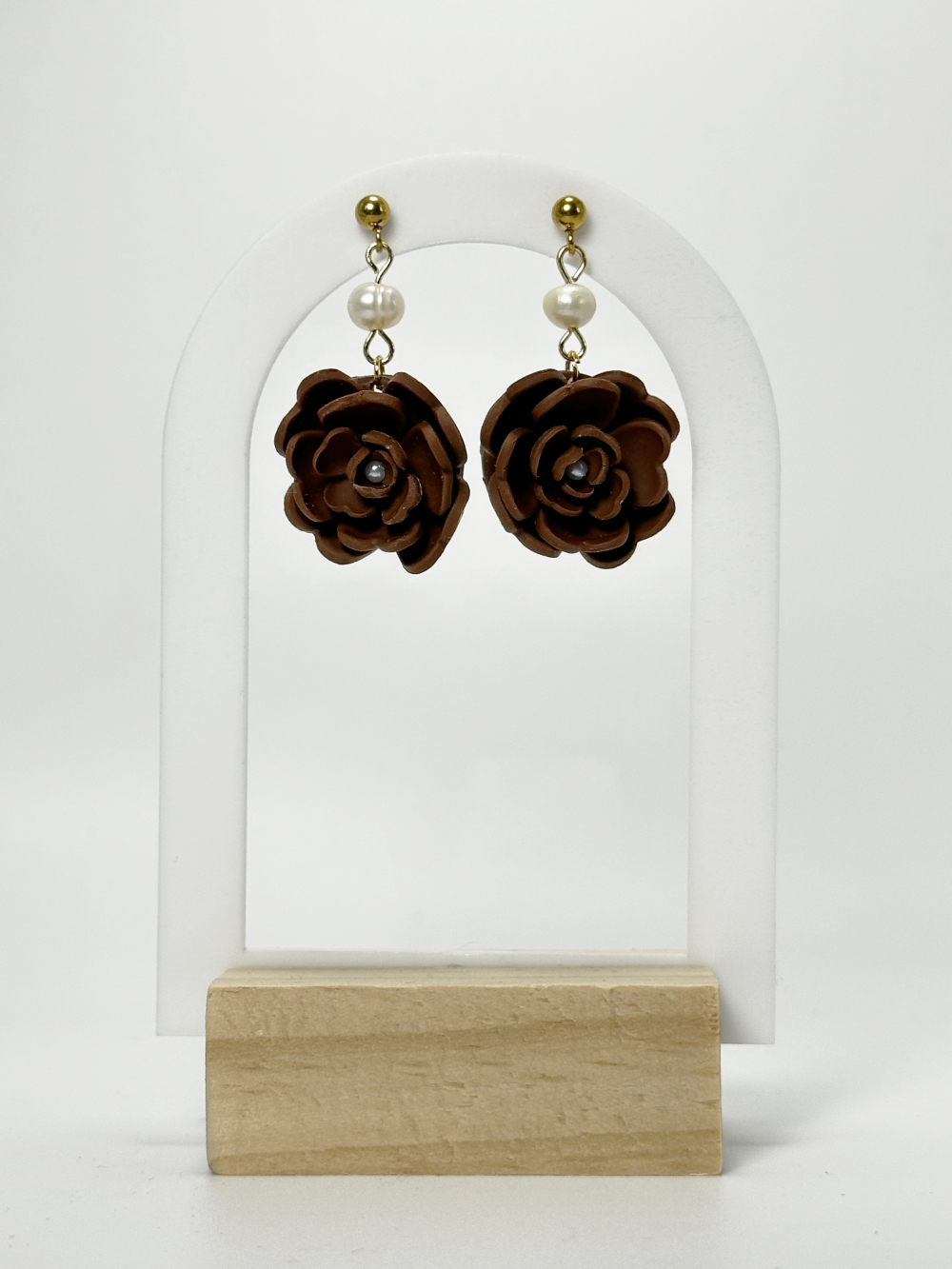 Handmade Brown floral earrings with pearls, made out of polymer clay. The pearls featured on the design are natural freshwater pearls. The earring hoops are made out of stainless steel, which is hypoallergenic and ideal for sensitive skin.