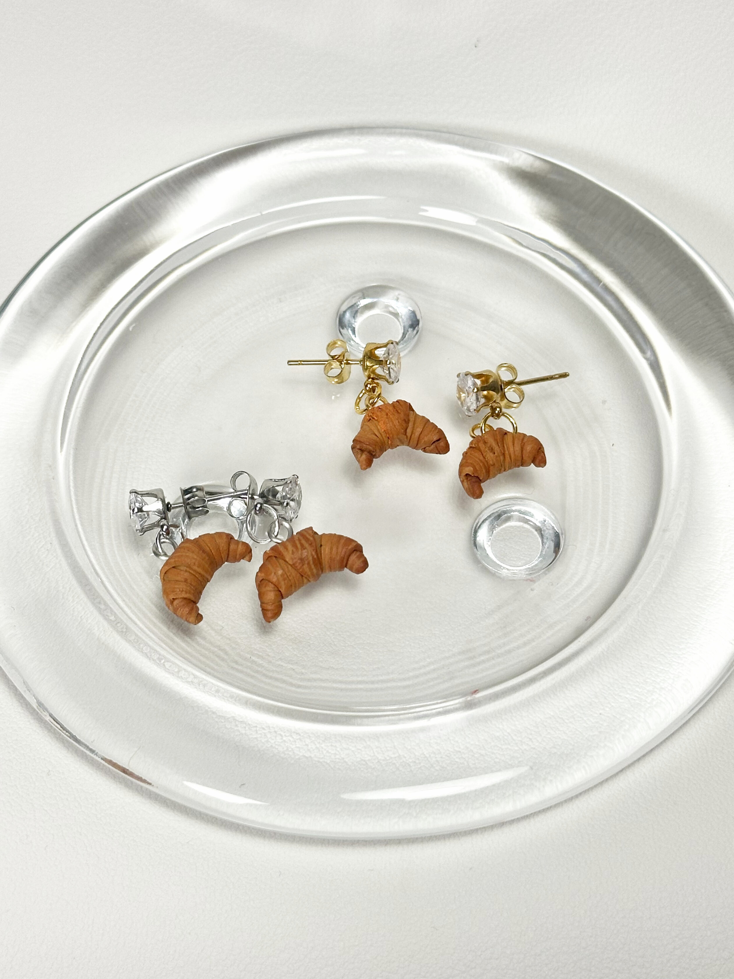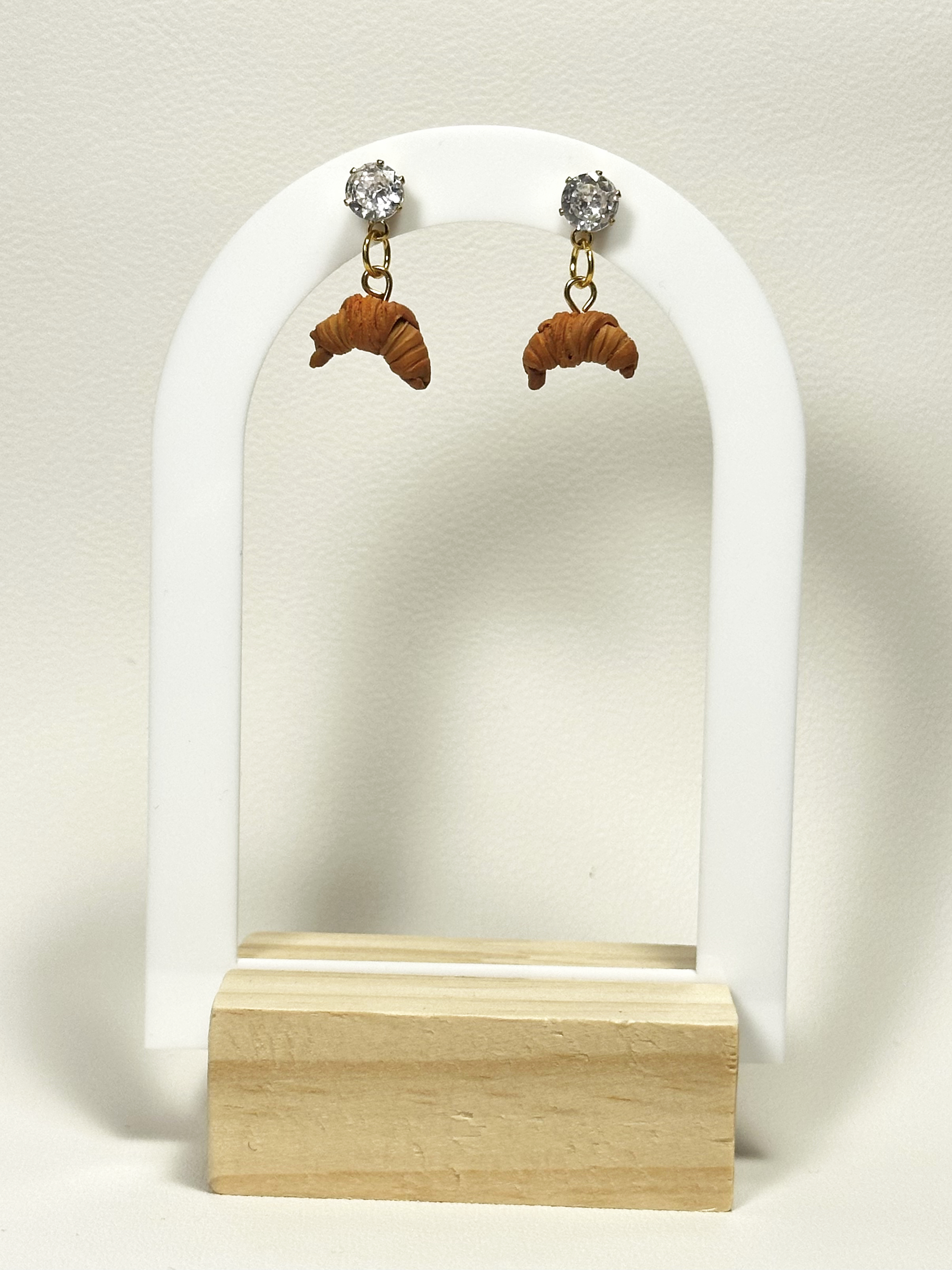 The Croissant Studs are made out of polymer clay. The studs are made of stainless steel, featuring shiny glass rhinestones.