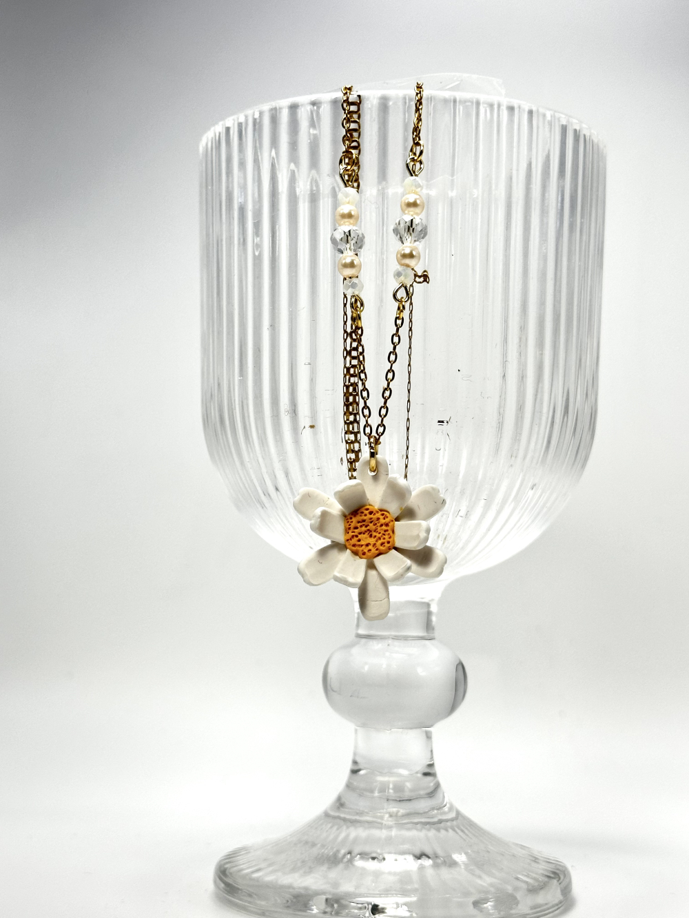 The Daisy necklace is handmade from polymer clay, featuring a large white daisy as the centerpiece, and multiple glass beads in various neutral colors. The chain and all metal elements of the necklace are made from stainless steel.