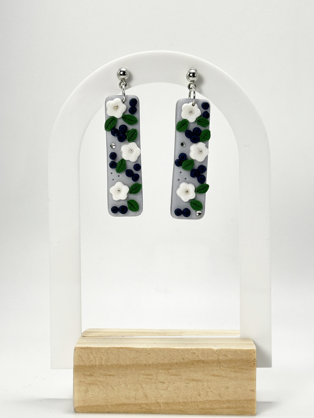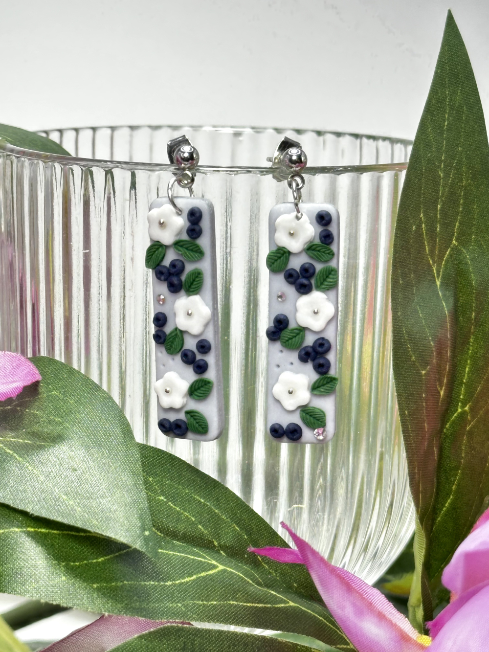 The Floral Blueberries earrings are made out of many tiny handmade blueberries, white flowers, and small green leaves, all made out of polymer clay. The earring hoops are made out of stainless steel.