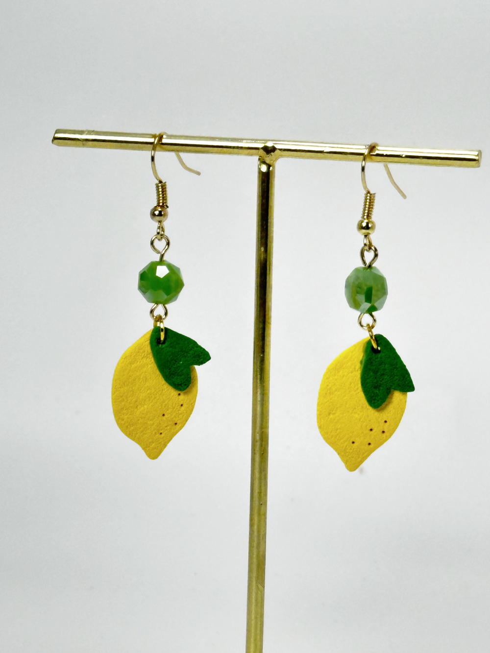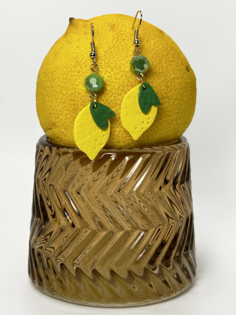 Handmade hanging lemon earrings, made with polymer clay. The beads featured on the design are glass beads in green tones. The earring hoops are made out of stainless steel, hypoallergenic, and ideal for sensitive skin.