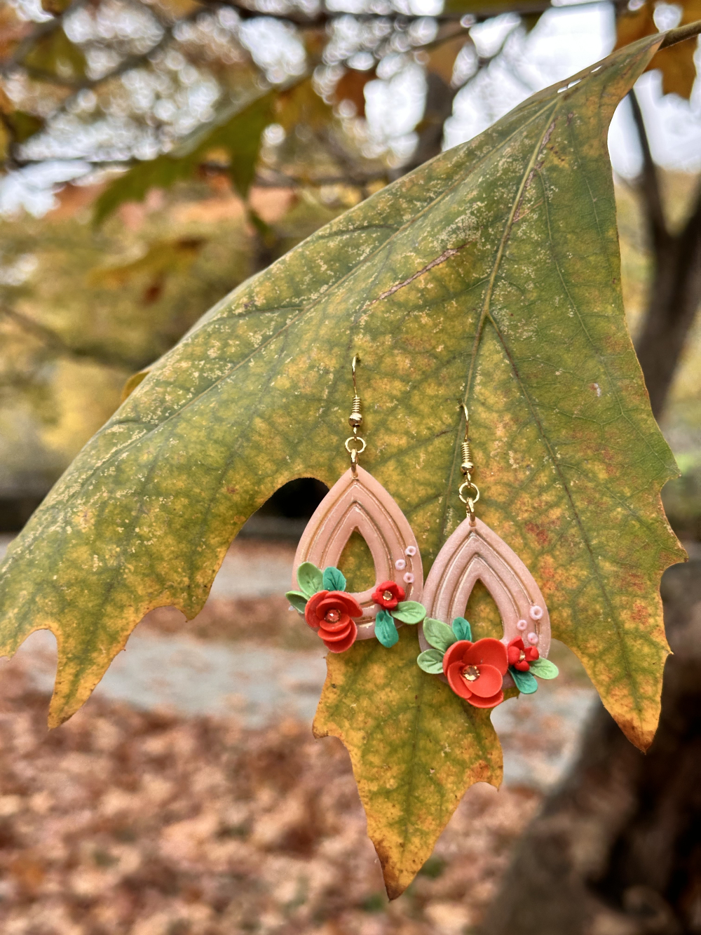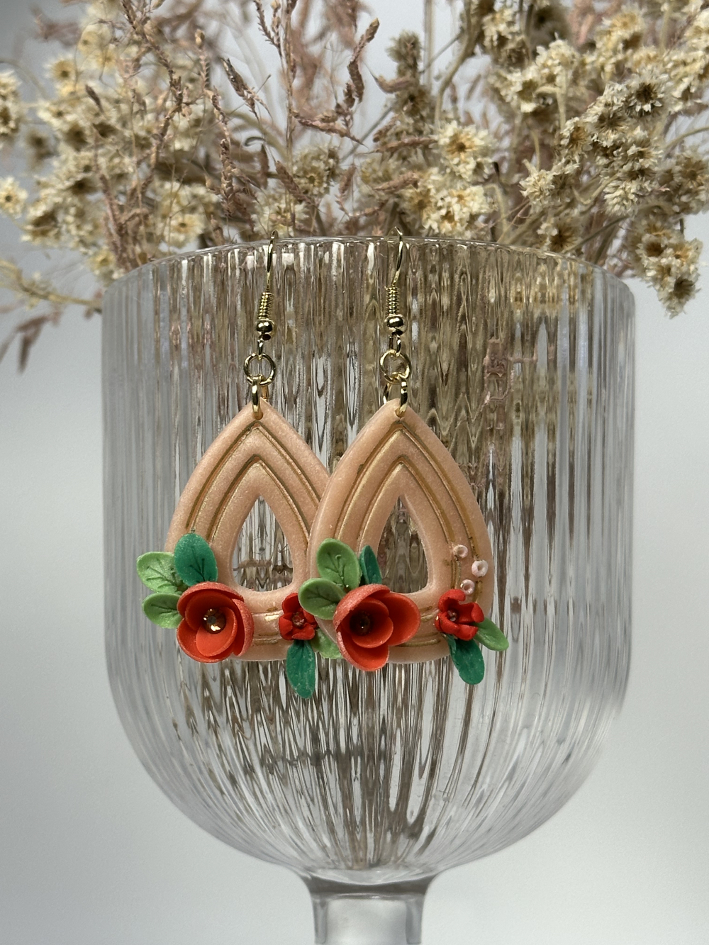 Handmade floral earrings in nude pink tones, decorated with orange flowers and small green leaves. Made with love out of polymer clay. The earring hoops are stainless steel, which is gold-plated, ideal for sensitive skin.