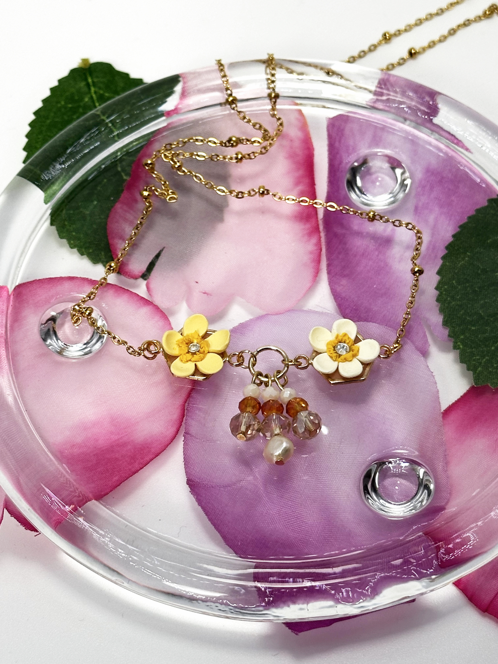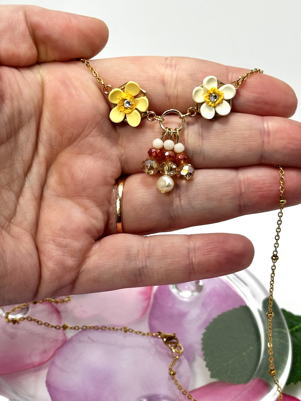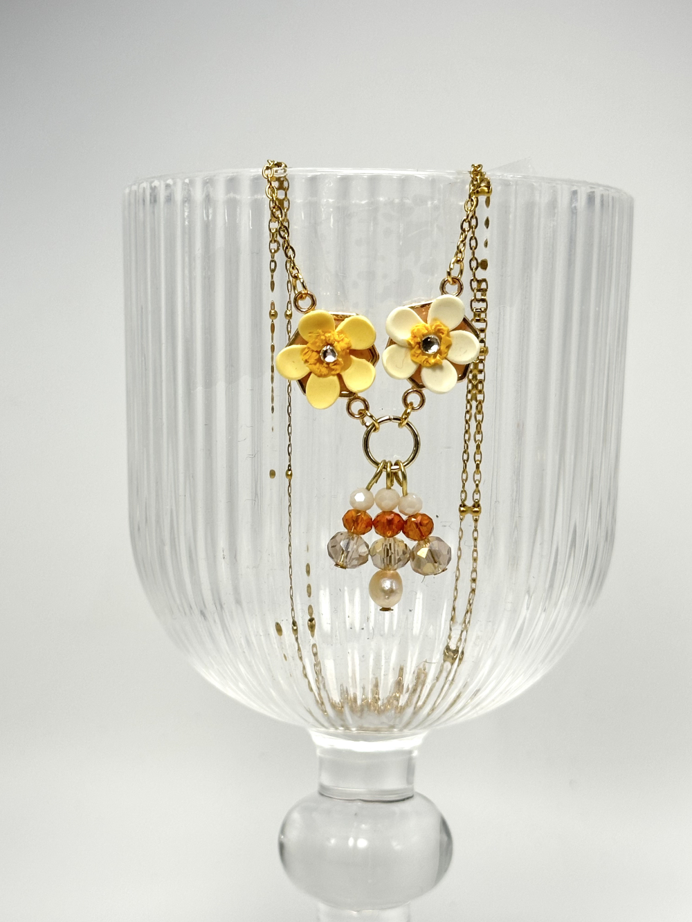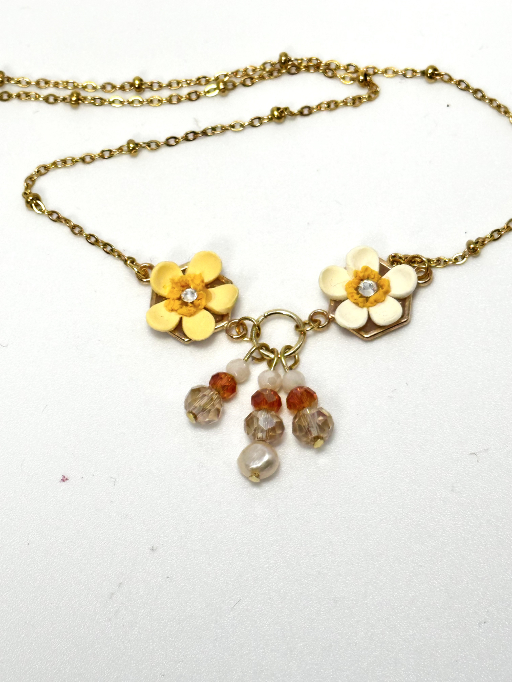 The Small Lilies Necklace features two handmade lilies in yellow and orange tones, made out of polymer clay and placed on a stainless steel frame. The necklace also features a freshwater pearl and multiple hanging glass beads in brown and neutral tones. The chain and all metal elements of the necklace are made of stainless steel.